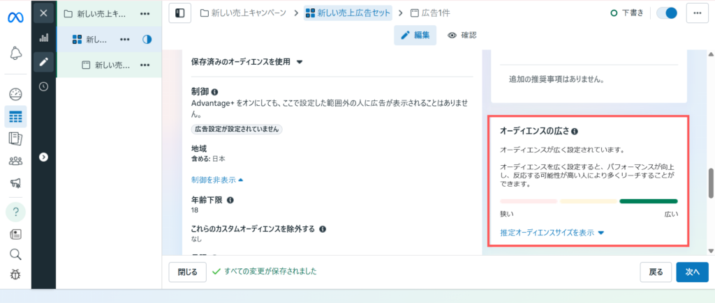 まず、基本的なチェック項目としては、オーディエンスの幅が広すぎていないかor狭すぎていないかという点です。